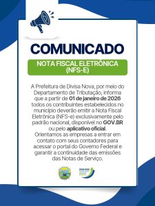 A partir de 01 de janeiro de 2026 todos os contribuintes estabelecidos no município deverão emitir a Nota Fiscal Eletrônica exclusivamente pelo padrão nacional, disponível no gov.br . Em casos de dúvidas, procure o seu contador.