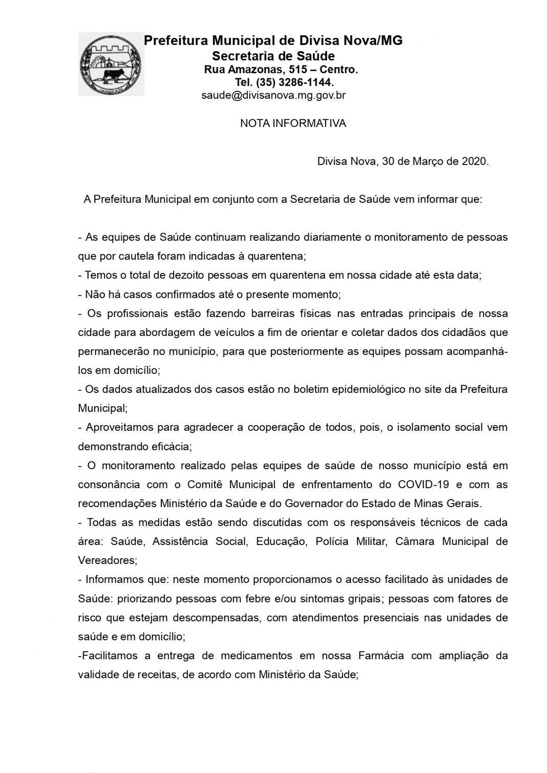 Praça Presidente Vargas, 01 - Centro - Divisa Nova-MG - CEP: 37142-000 - Telefone: (35) 3286-1200 - email: sac@divisanova.mg.gov.br - www.divisanova.mg.gov.br